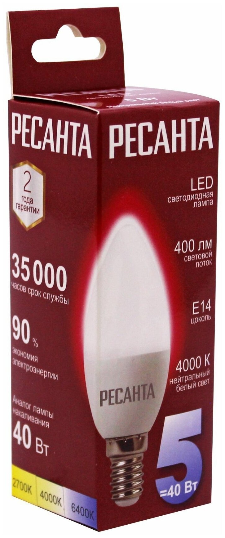 Лампа светодиодная LL-R-C37-5W-230-4K-E14 (свеча, 5Вт, нейтр., Е14) Ресанта, арт. 76/1/2, 1 уп. (в упаковке 10 шт.) информация: