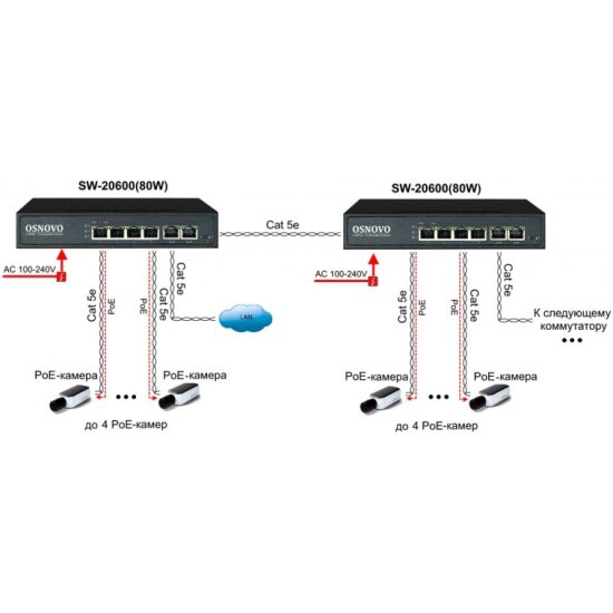 OSNOVO PoE коммутатор 6 портов, 4 PoE порта 10/100 Base-T, 2*10/100 Base-T Uplink, до 30W на порт, суммарно до 80W 4 534 ₽