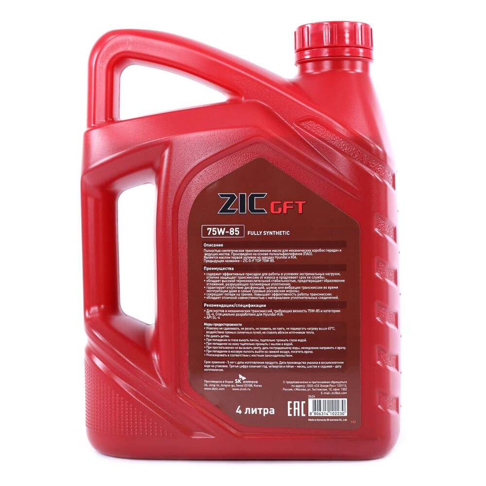 Масло ZIC G-F TOP GL-4 КИА, хендай GFT 75W85, синтетика, 4 литра 162624 информация: