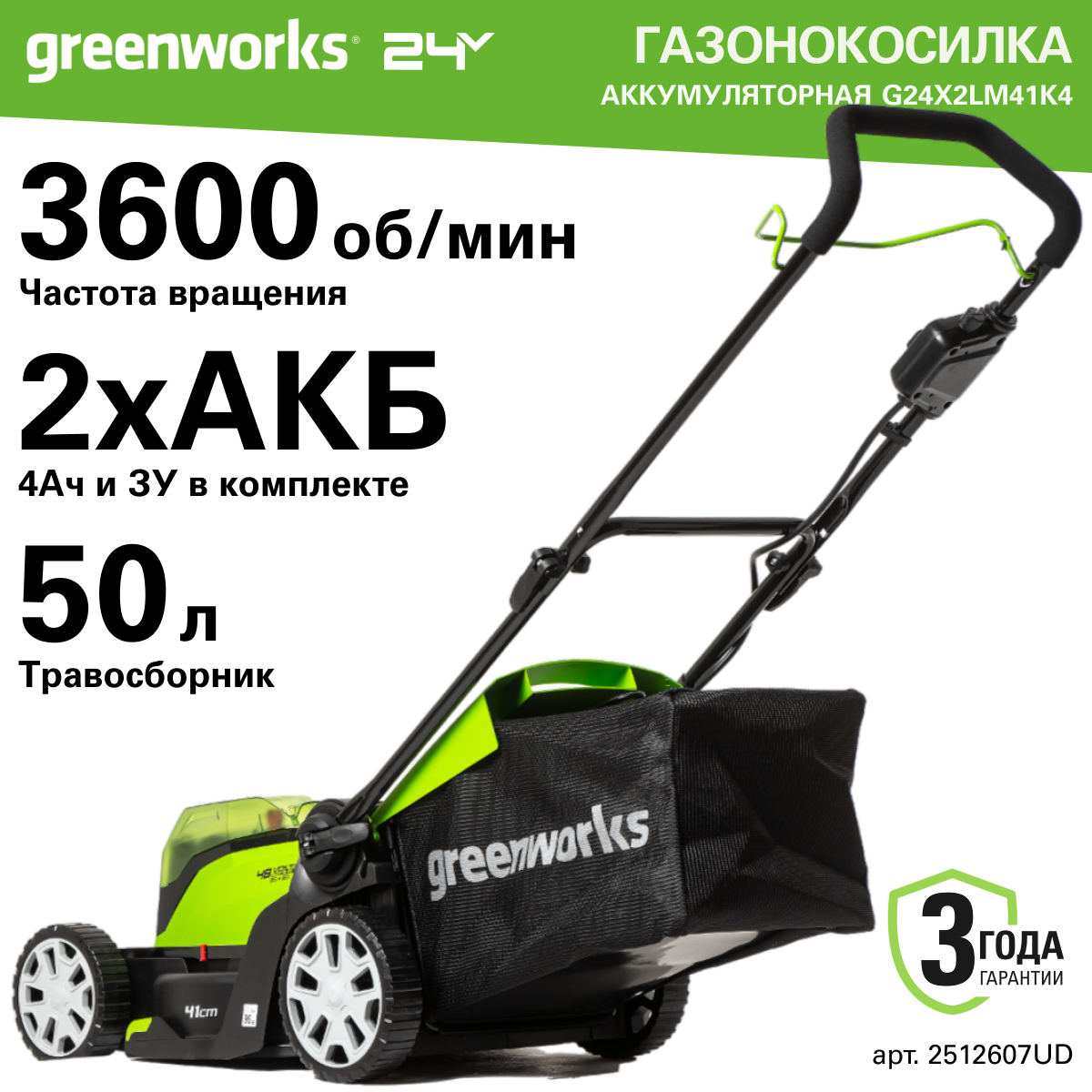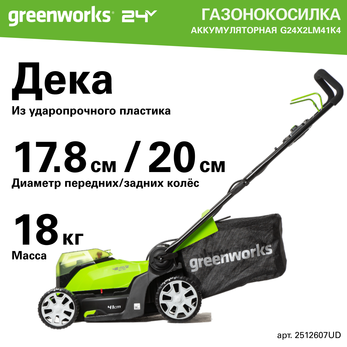 Газонокосилка аккумуляторная Greenworks Арт.2512607UD, 2*24V, 41 см, с 2хАКБ 4Ач и ЗУ информация:
