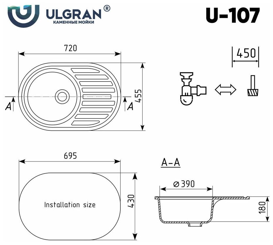 Мойка Ulgran, мрамор, U-107-308, (720*455*180 мм), черный, сифон и сливная арматура