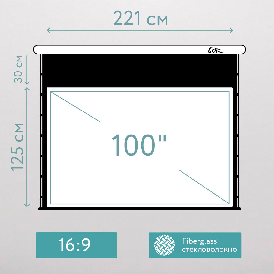 Экран SOK SCPSM-332x186FG-ED90 Pro 150 16:9 настенно-потолочный, моторизованный, Fiberglass, белый