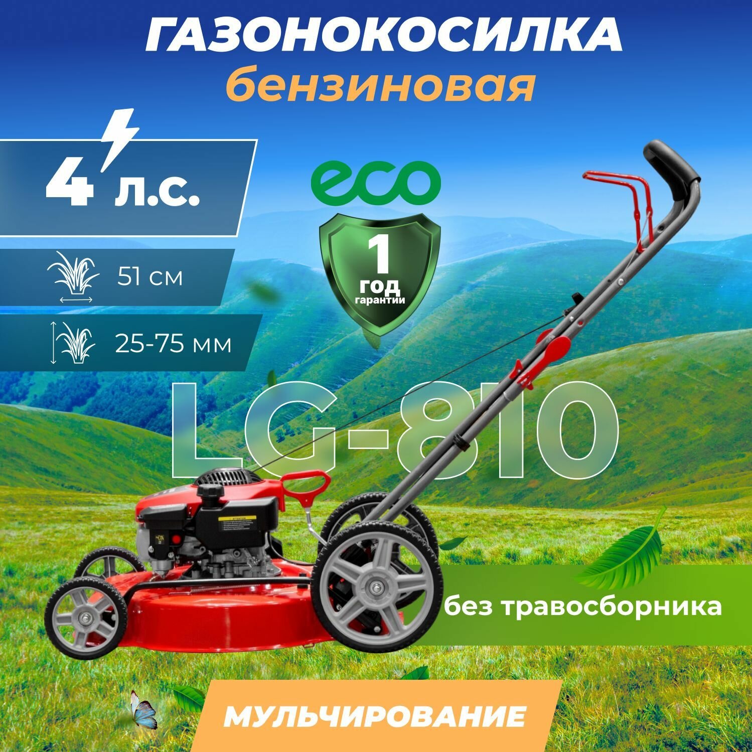 Отзывы на Газонокосилка бензиновая ECO LG-810 (4.0 л.с., шир. 51 см, ручной привод, мульчир., стальн.корпус, без травосборника) (EC1507-3) (EC1507-3)