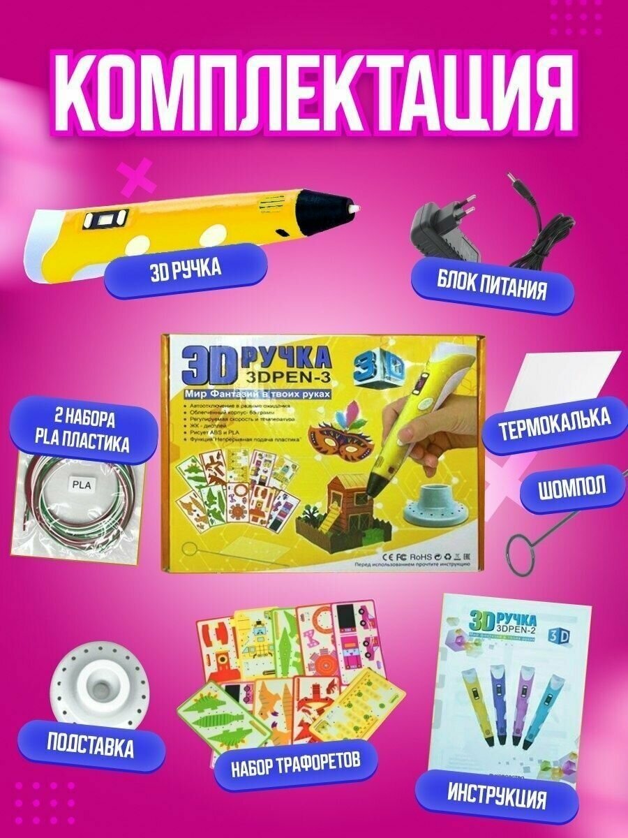 3Д Ручка детская 3DPEN-3, 3д ручка для творчества 3-го поколения, Набор для творчества с трафаретом и пластиком, Желтый, Pricemin