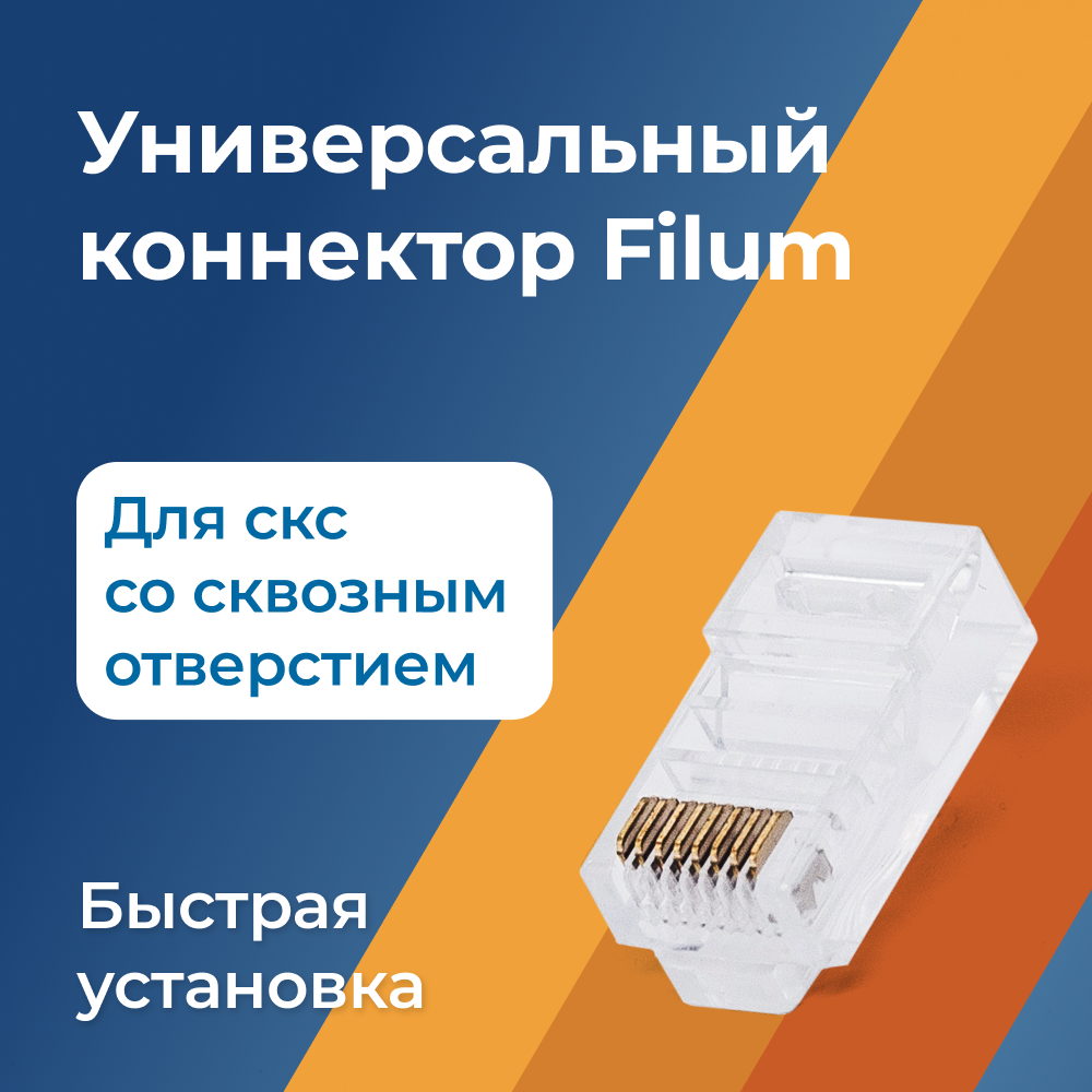 Коннектор Filum FL-NA-PLUG6-5 RJ-45, 6 кат, сквозные отверстия, 8p8c, 50 мкм, универсальный, для одножильного и многожильного кабеля, уп/100 шт