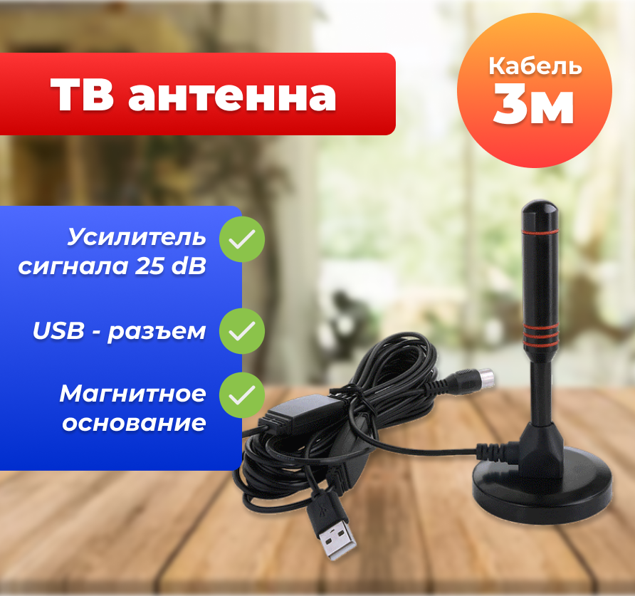 10 цен на ТВ антенна комнатная с усилителем сигнала на магните (USB,25дБ) черная