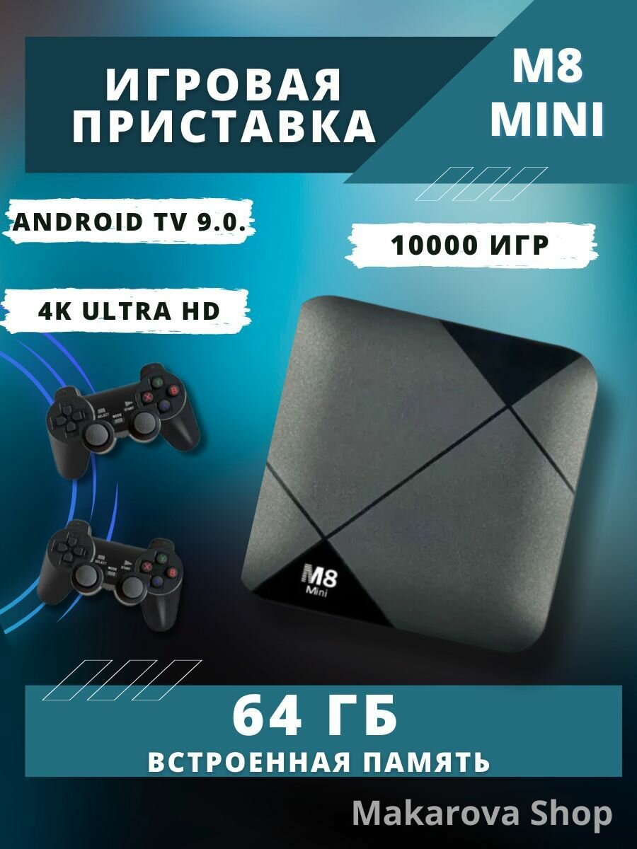 10 цен на Игровая приставка Game Box m8 Ultra HD + Android TV 64 GB + 10000 встроенных игр + 2 беспроводных геймпада + пульт ДУ (Черный)