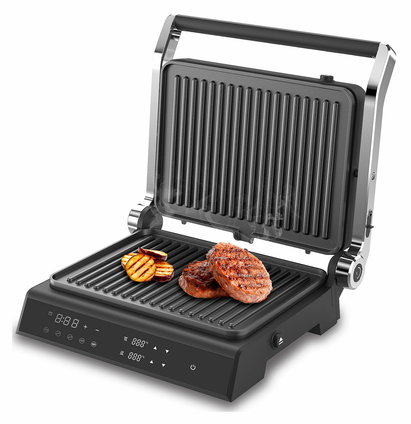 | Особенности | антипригарное покрытие / крышка / поддон для сбора жира / регулировка высоты верхней панели / съемные пластины / можно мыть в посудомоечной машине / сенсорное управление |
