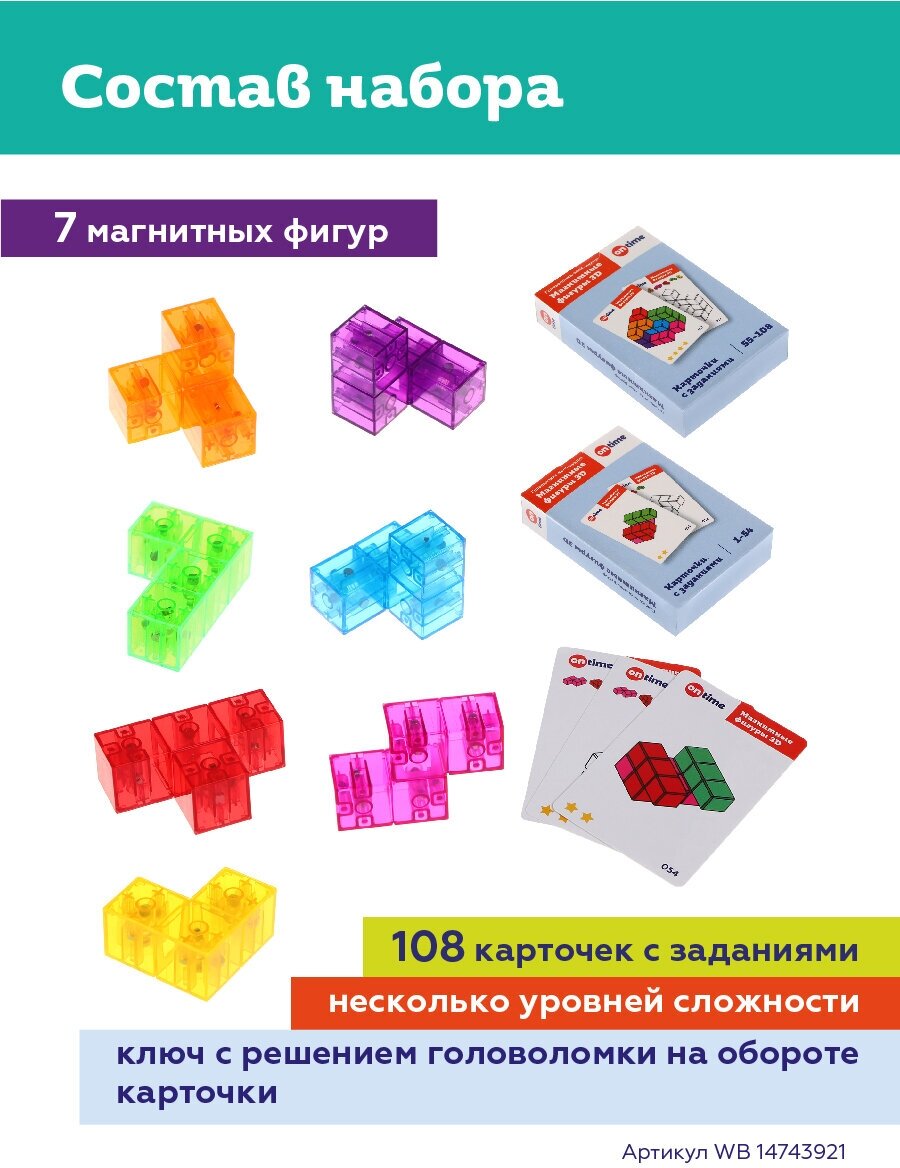 Магнитный головоломка - конструктор On Time "Фигуры 3D", для развития логики, 7 элементов, карточки на 108 заданий в комплекте, игры в дорогу