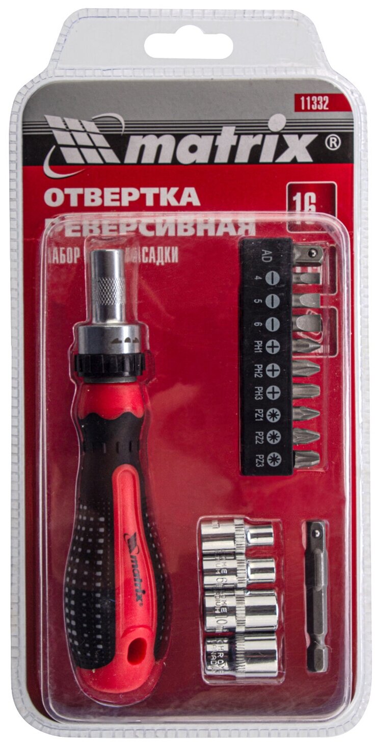 Отвёртка реверсивная с набором бит и насадок торцевых 16шт MATRIX 11332