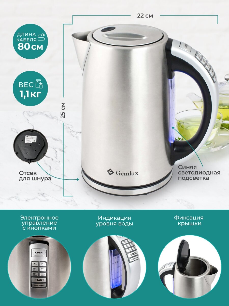 10 цен на Чайник Gemlux GL-EK-9217WF регулировка температуры измерительная шкала фильтр от накипи отсек для шнура 1.7л, 22.9 х 22.9 х 30см