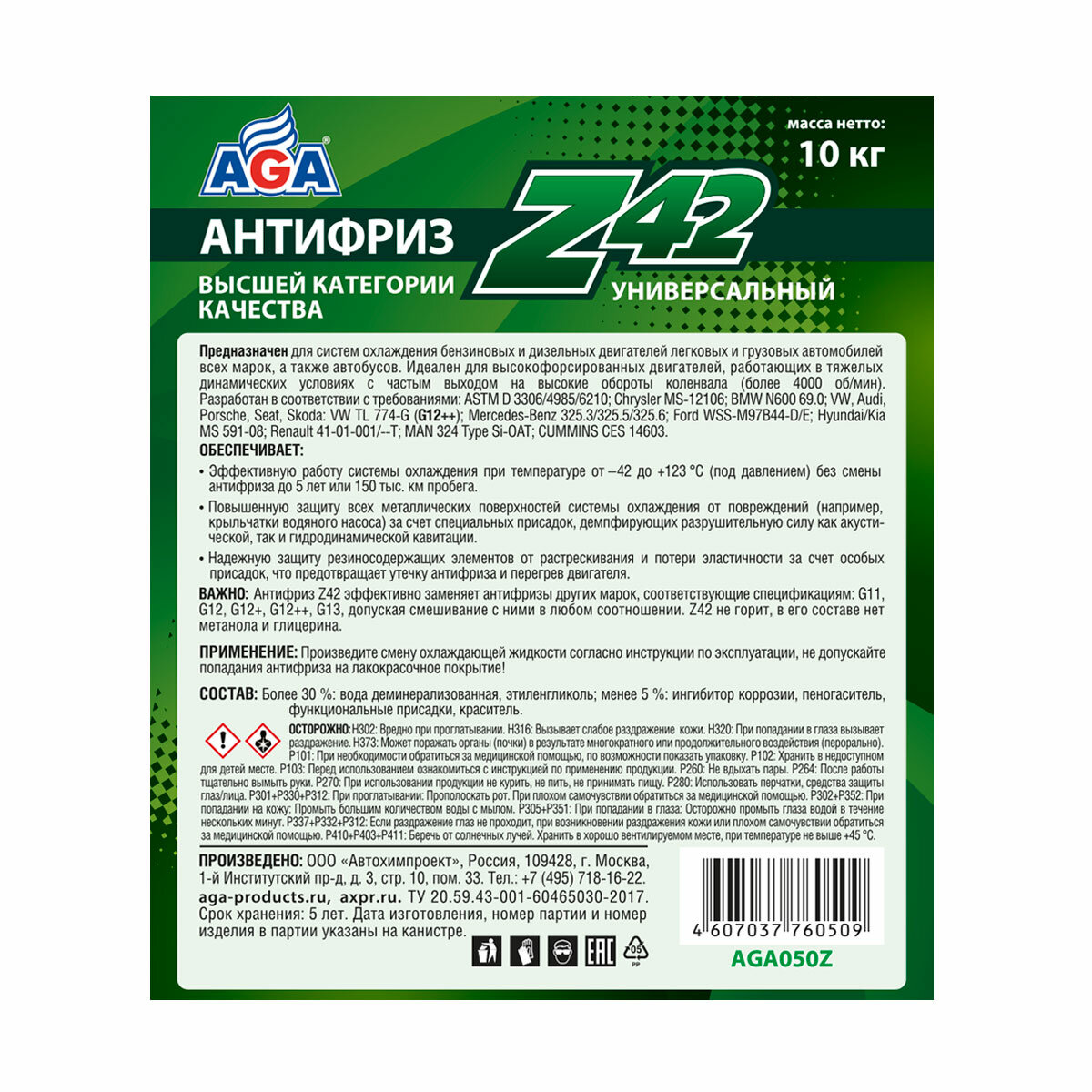 Антифриз AGA Z42 зеленый (9.46 л/10 кг) AGA050Z информация: