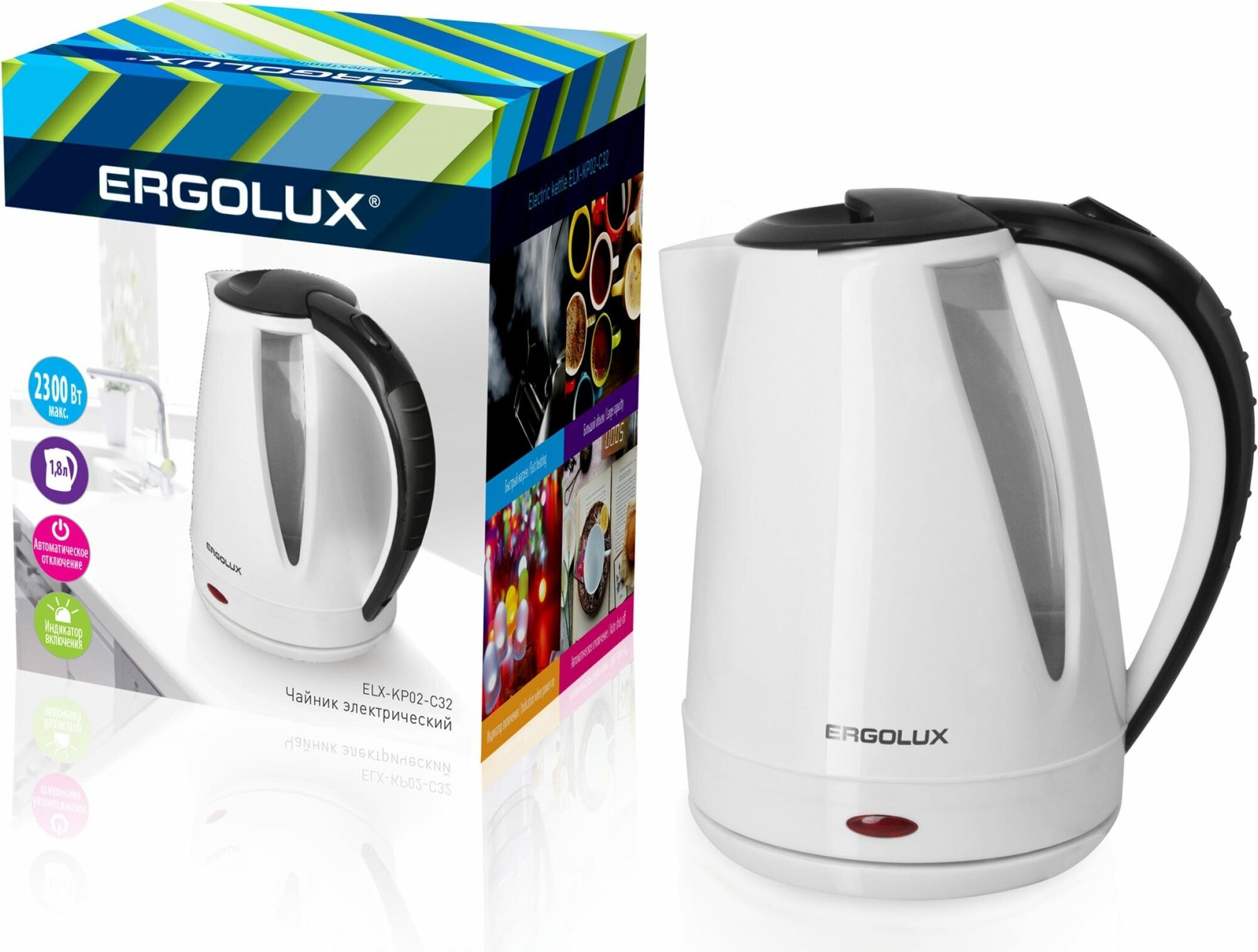 Чайник пластиковый ERGOLUX ELX-KP02-C32 белый/черный, 1.8л, 160-250В, 1500-2300В