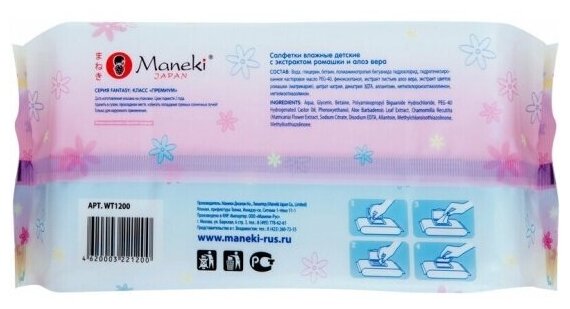 Maneki fantasy салфетки влажные, детские с экстрактом ромашки и алоэ вера, 80 шт.
