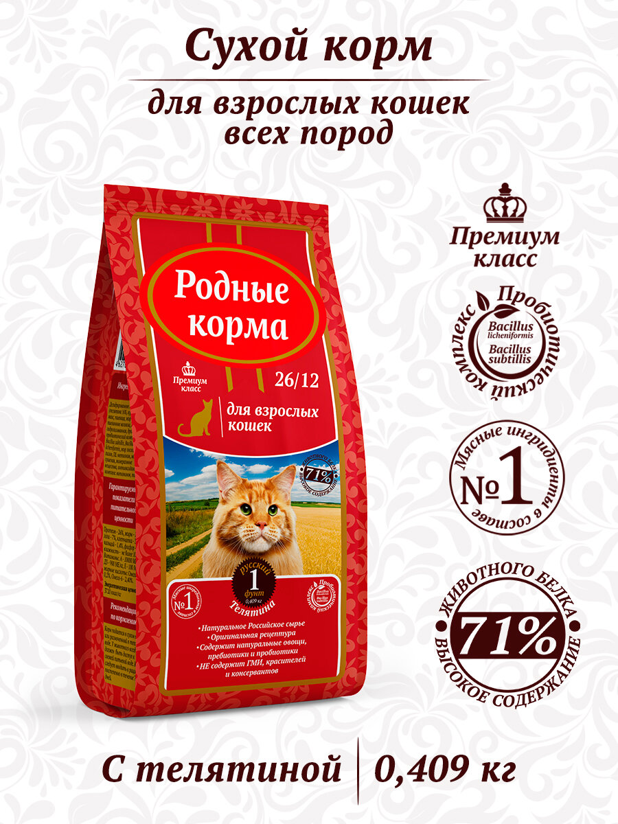 Родные корма 26/12 1 русский фунт 409 г сухой корм для взрослых кошек с телятиной 1х24