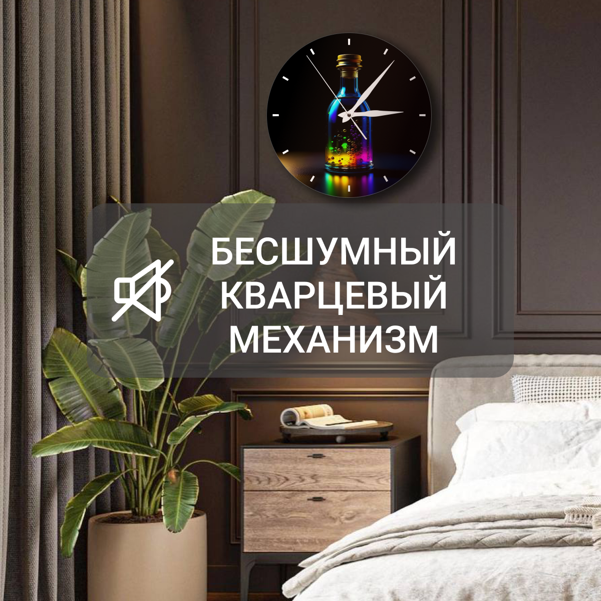 Отзывы на Деревянные настенные часы, диаметр 28см/ Большие кварцевые бесшумные интерьерные часы с принтом/ часы-картина на стену/, в бутылке цветные капли