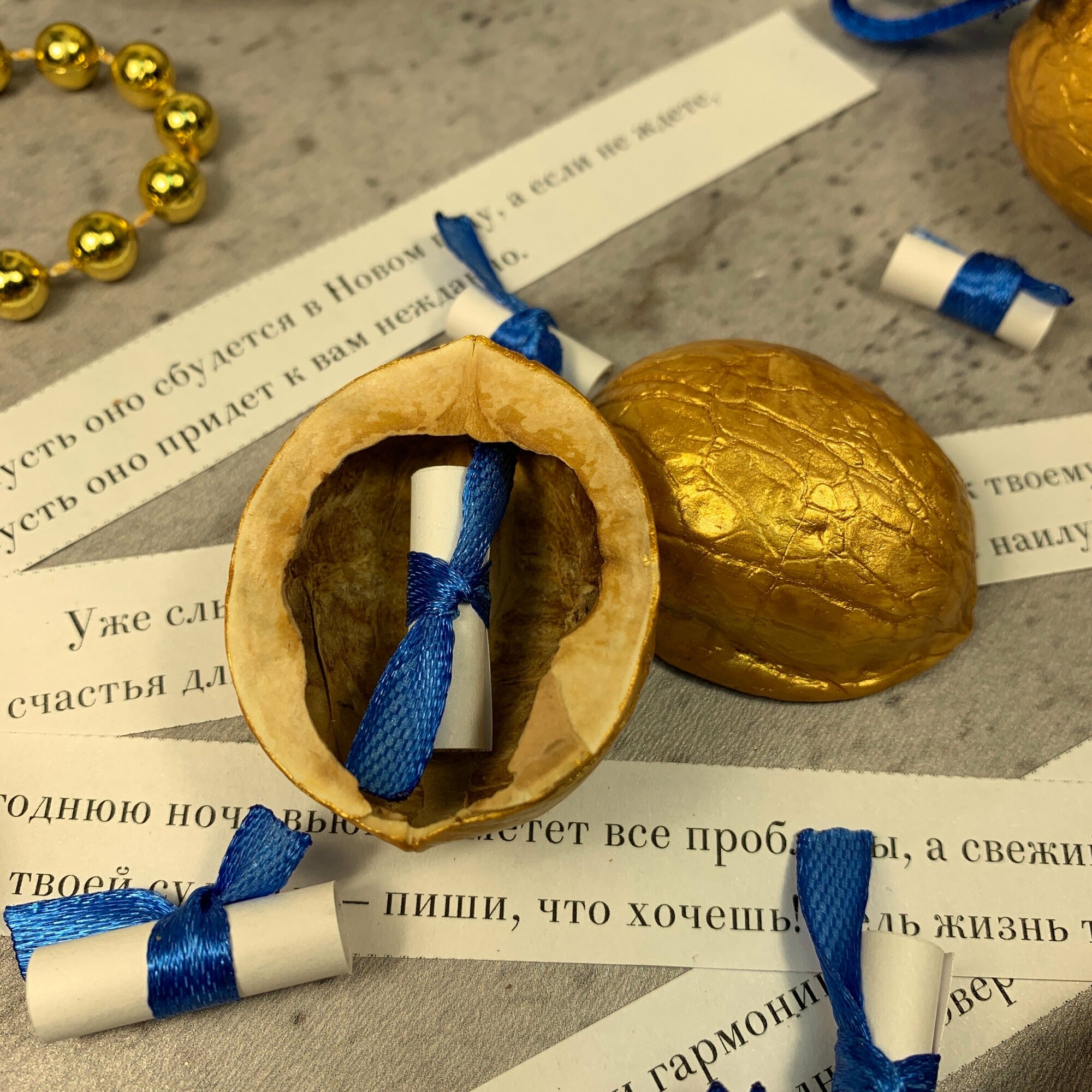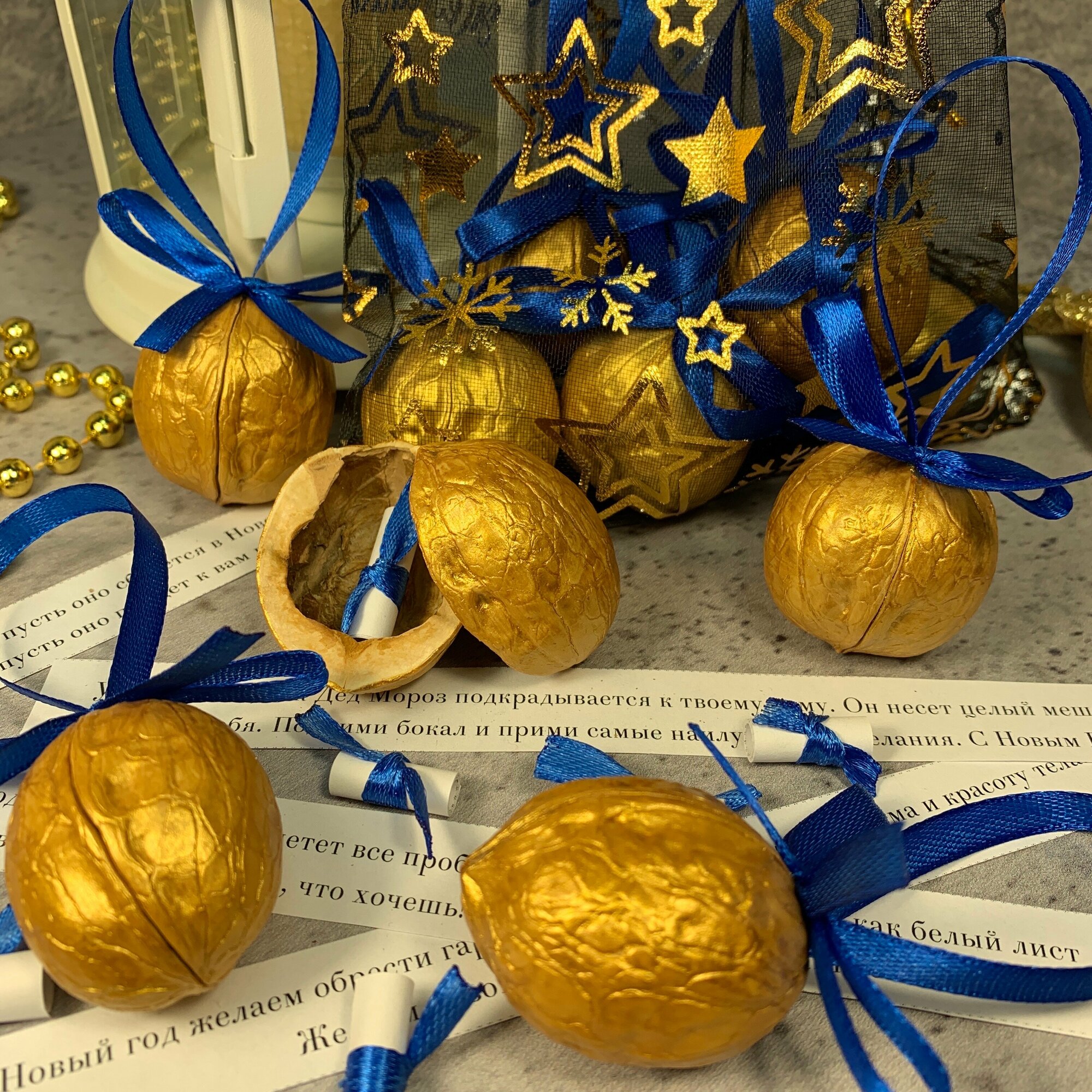 Отзывы на Орешки с предсказаниями подарок на Новый год и Рождество. Подарочный набор из 10 штук в мешочке (золото с синей ленточкой)