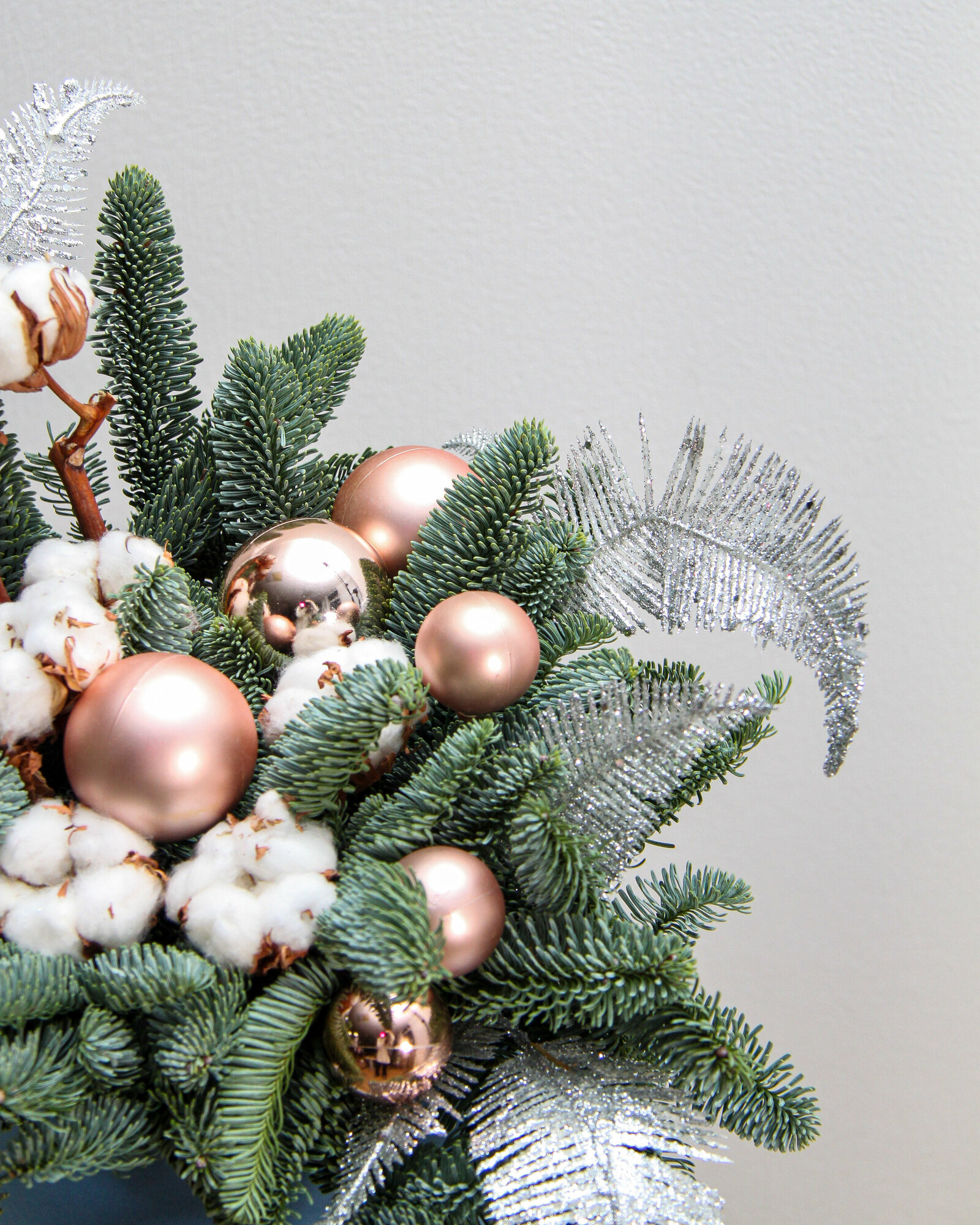 10 цен на Букет хвойный Снежная королева, Н53 см, с хлопком, серебром и новогодним декором в шляпной коробке