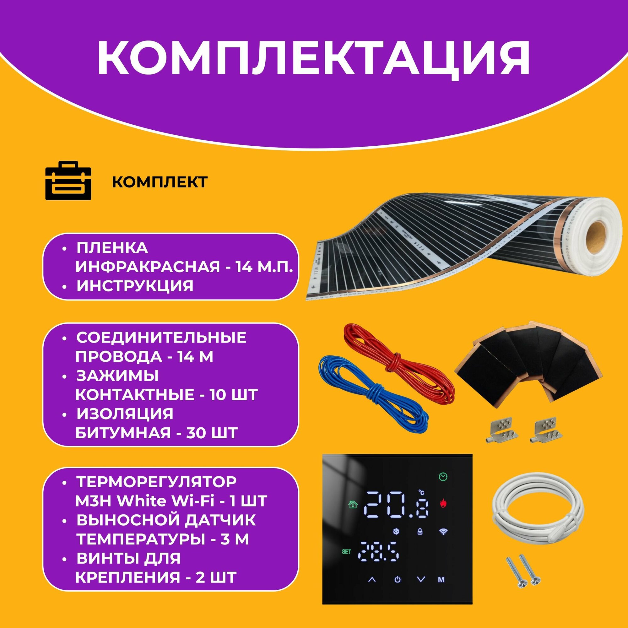 Теплый пол инфракрасный электрический пленочный под ламинат / линолеум / ковролин. Комплект с чёрным терморегулятором. Инфракрасная пленка ширина 100 см 14 м2 wi-fi информация: