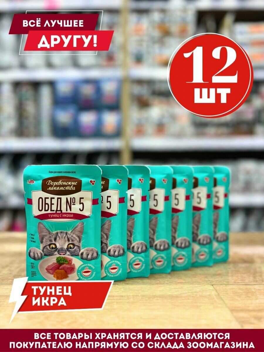10 цен на Деревенские лакомства влажный корм для кошек обед №5 тунец с икрой 50гр. 12штук