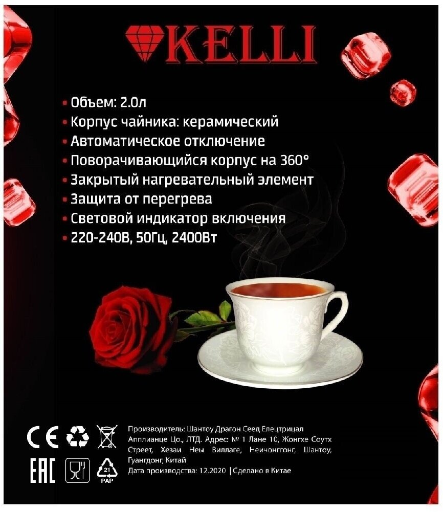 Чайник электрический керамический Kelli KL-1341, 2200Вт, 2л 2 370 ₽