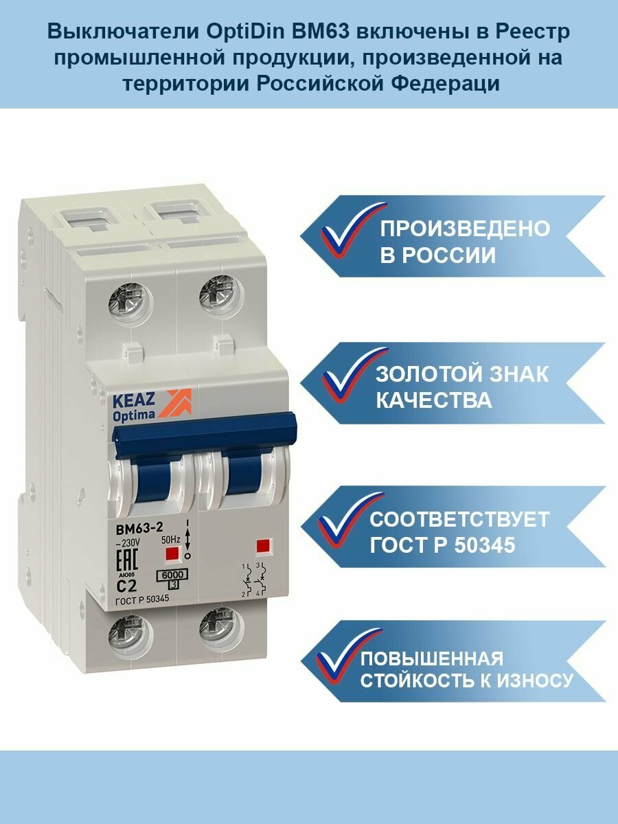Выключатель автоматический модульный 2п C 2А 6кА OptiDin BM63-2C2-УХЛ3, КЭАЗ 260603 (1 шт.) информация: