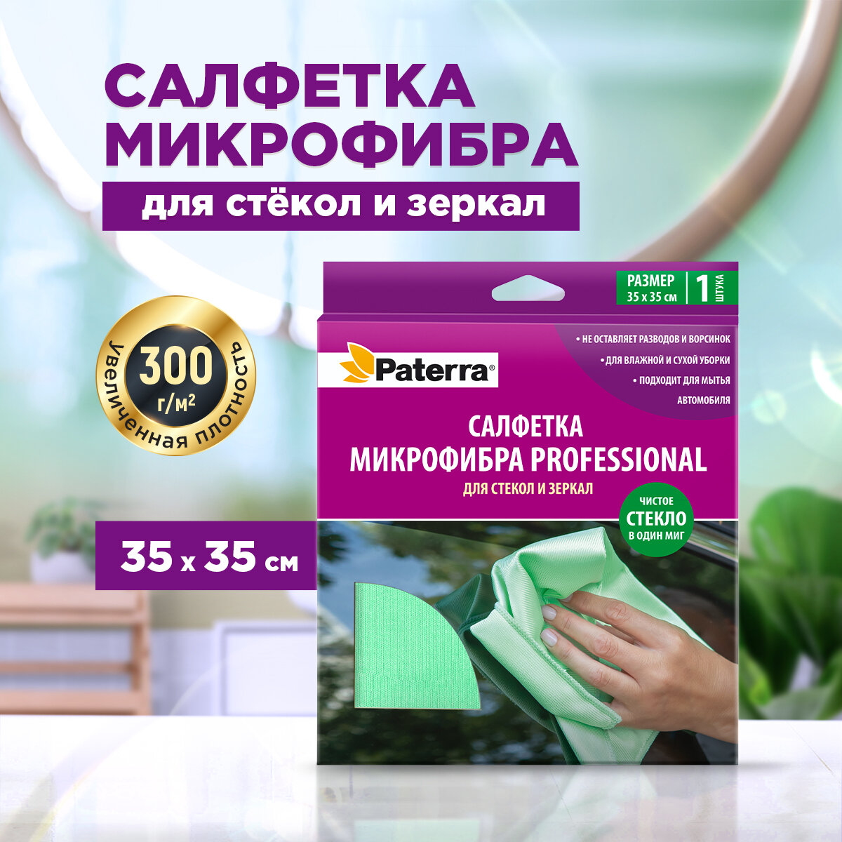 Салфетка микрофибра PROFESSIONAL, для стекол и зеркал, 35 * 35 см, в картонной упаковке, PATERRA