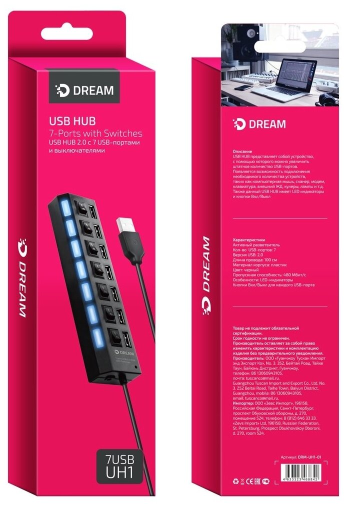 Разветвитель USB Dream DRM-UH1 с 7 портами, активный, длина кабеля 0,5 метра информация: