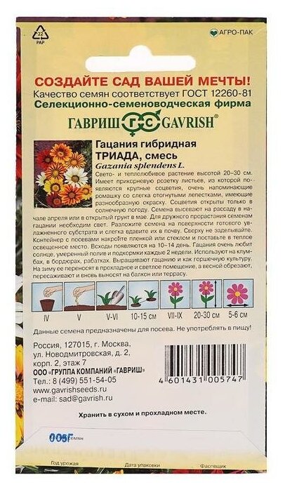 Семена 10 упаковок! Гацания Триада 0,05г Одн смесь 30см (Гавриш)