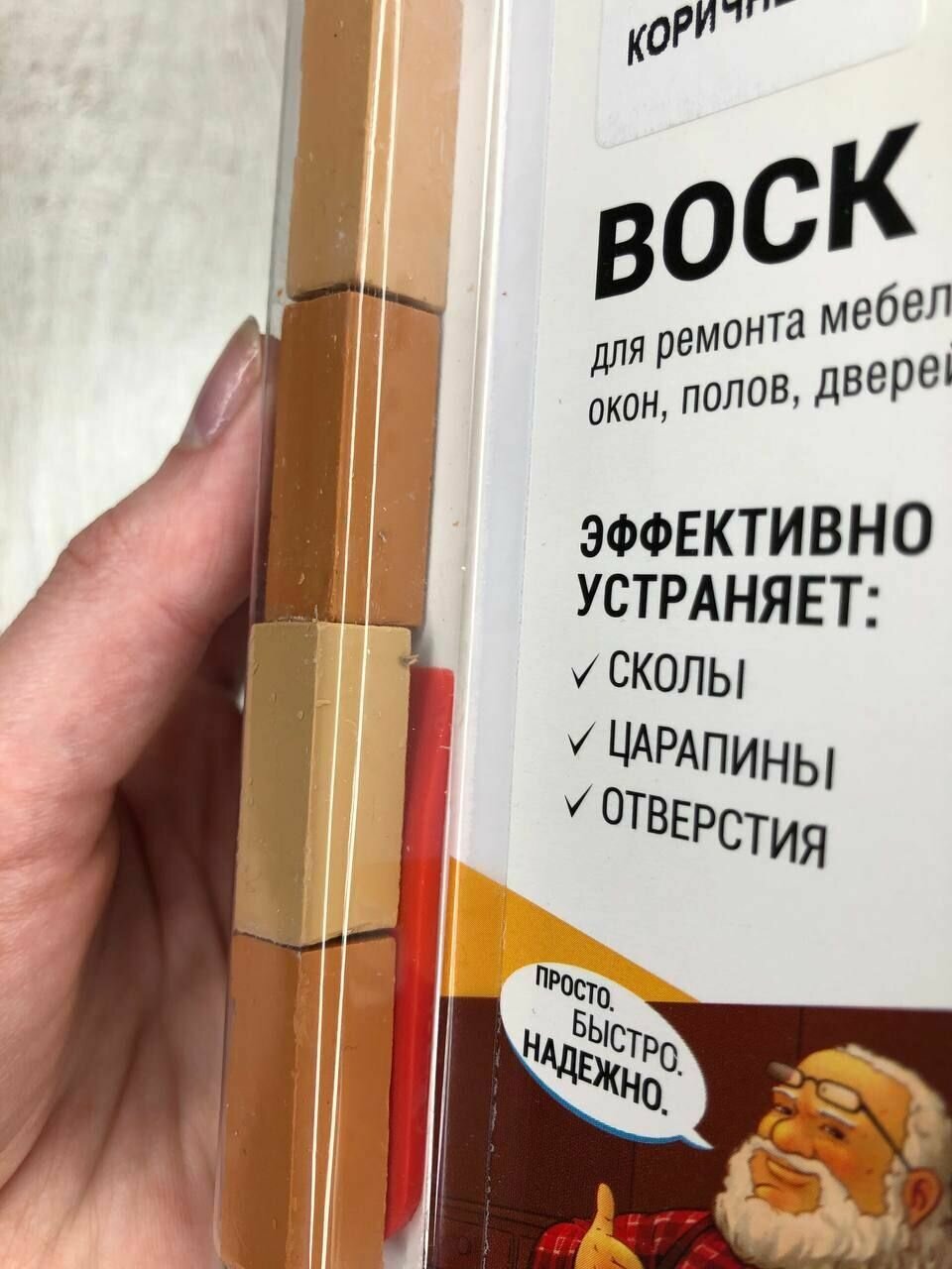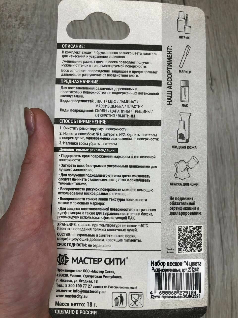 | Дополнительная информация | в набор входит 4 бруска воска разного цвета, шпатель для нанесения и удаления излишков; имеет ограниченную механическую прочность, не дает усадки; образует влагостойкое покрытие |