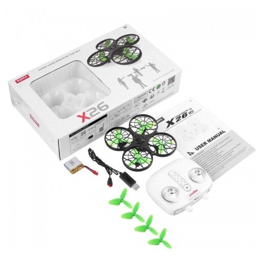| Комплектация | Комплектация: • радиоуправляемый квадрокоптер X26 • пульт дистанционного управления 2.4GHz • запасные винты • кабель USB для зарядки • инструкция |
