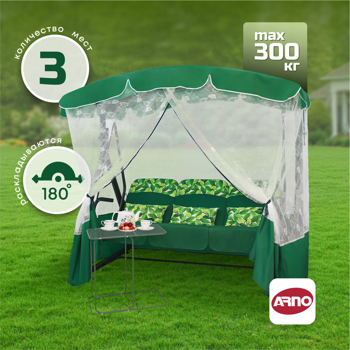 Качели садовые трёхместные Arno Элегант Премиум 2016-КД-45/П зеленый/цветы, до 300 кг информация: