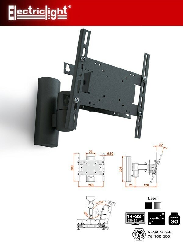 Кронштейн для телевизора на стену наклонно-поворотный с диагональю 14"-32" Electriclight КБ-01-27,металлик