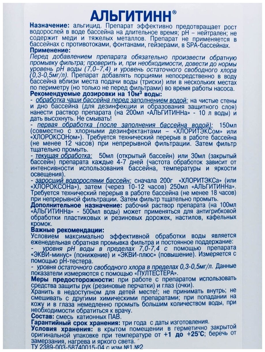 Жидкое средство для обработки плавательных бассейнов альгитинн (предотвращает рост водорослей), 1л.