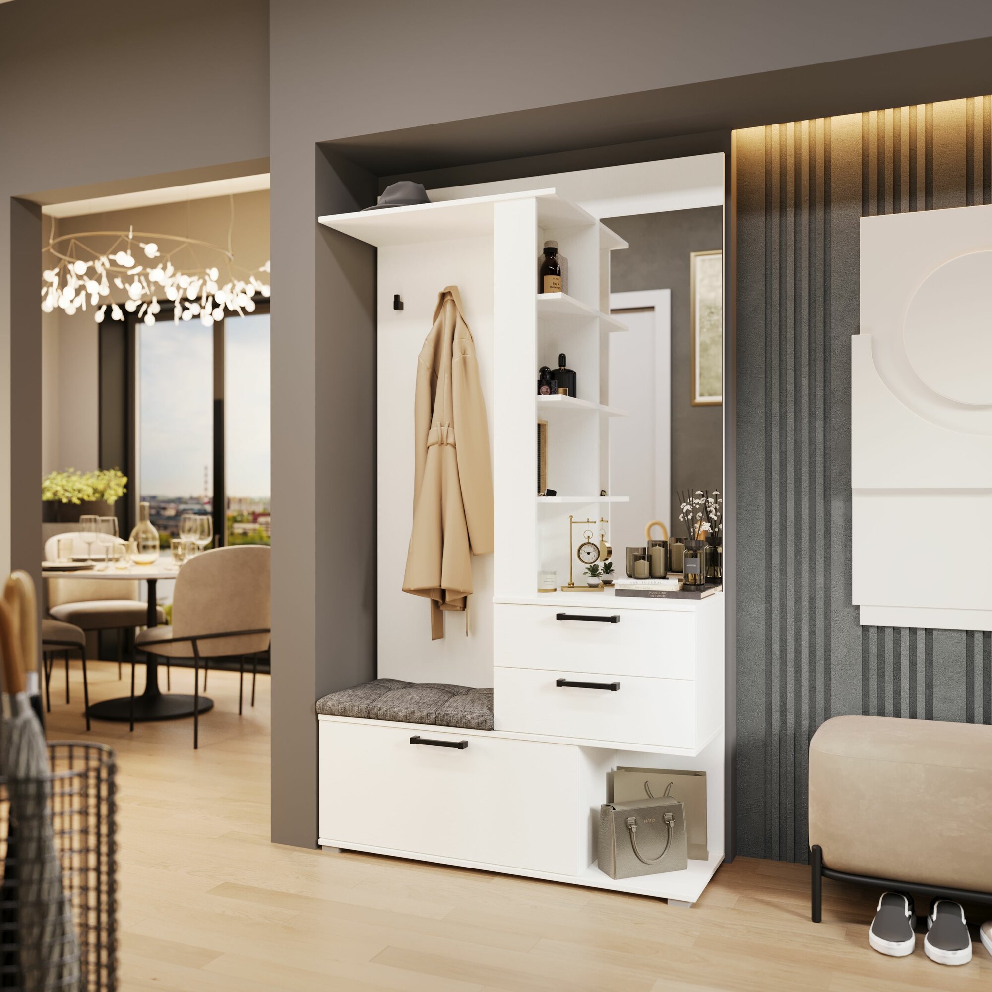 Прихожая мебель в коридор белая с зеркалом и ящиками (ВхШхГ) 198х109х36 см, Эрика тип 2 информация: