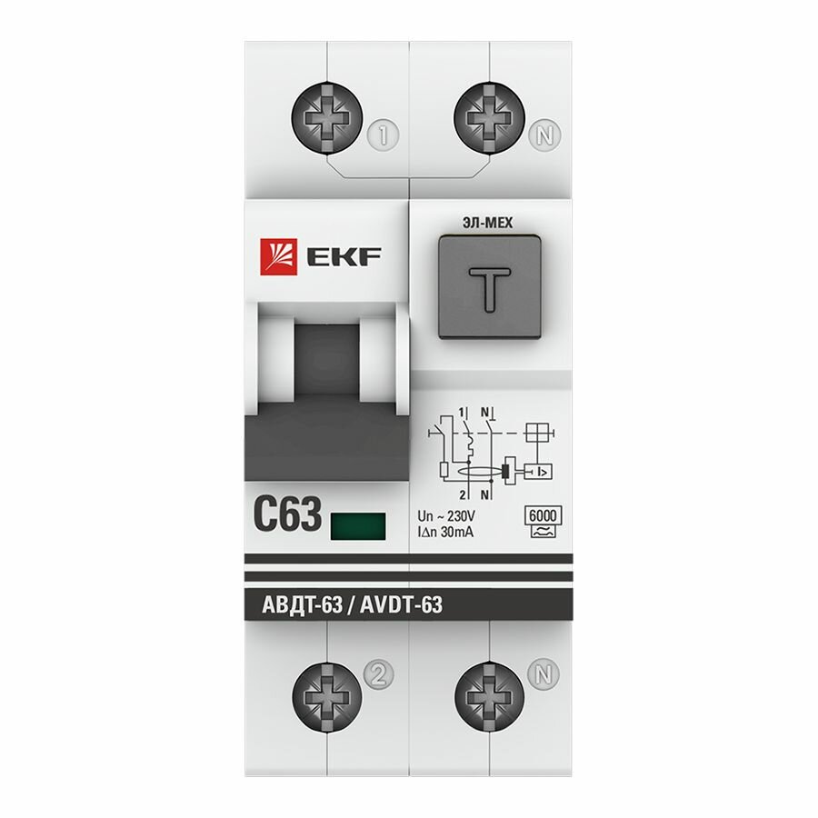 Дифференциальный автомат АВДТ-63 63А-30мА (характеристика C, эл-мех, тип А) 6кА EKF PROxima информация: