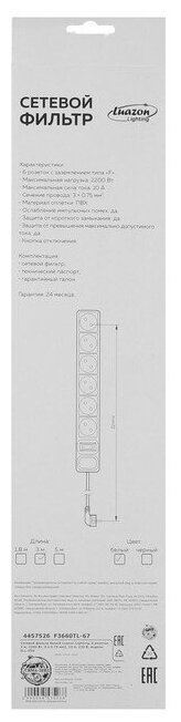 Сетевой фильтр Luazon Lighting, 6 розеток, 3 м, 2200 Вт, 3 х 0.75 мм2, 10 А, 220 В, белый информация: