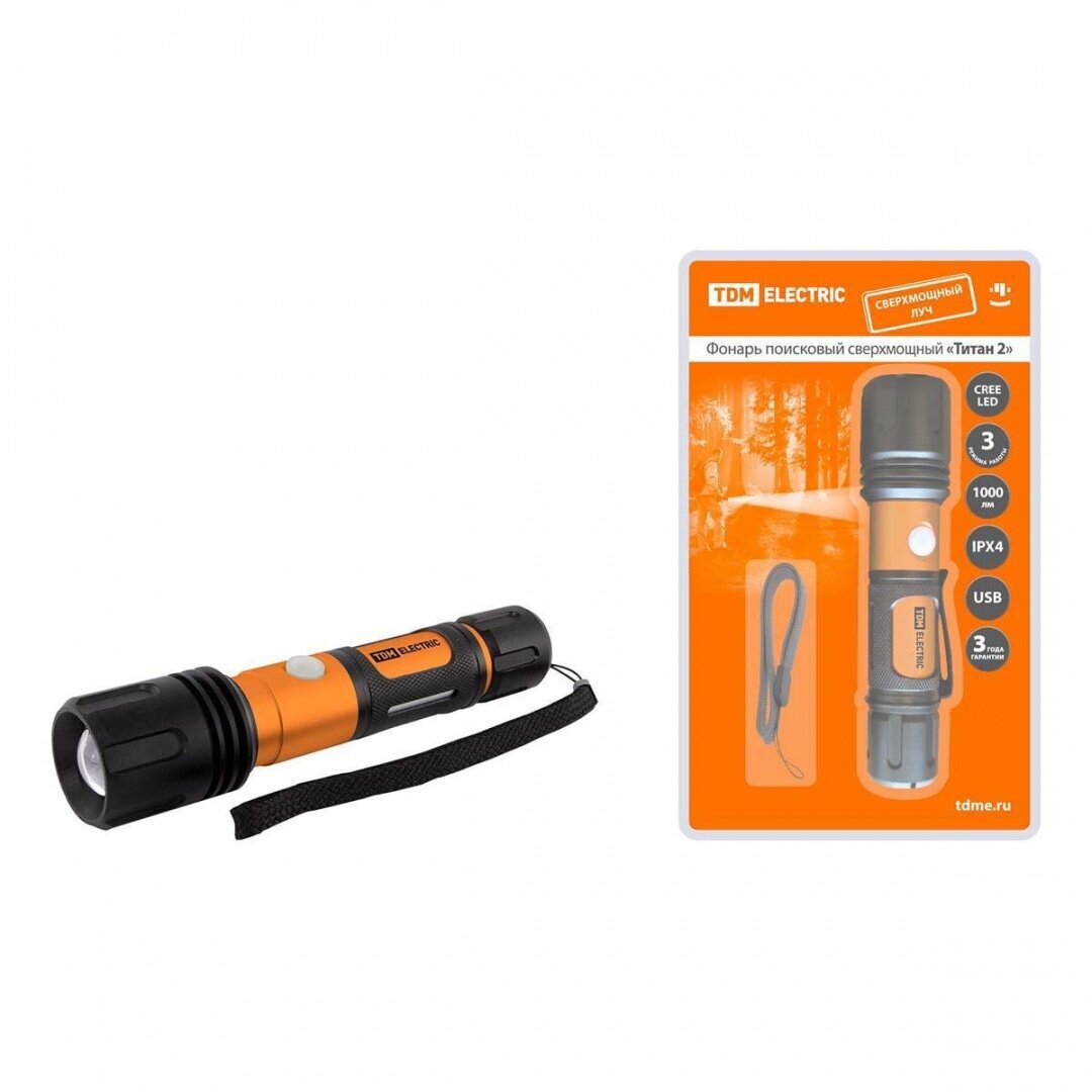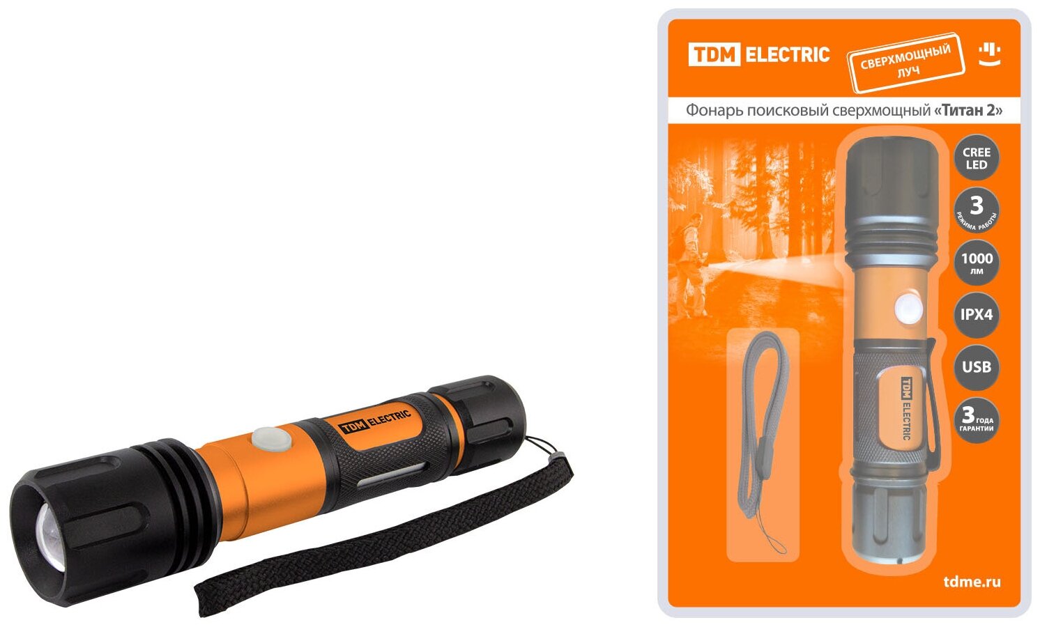 Фонарь TDM «Титан 2» 10 Вт 1 светодиод CREE 1000 лм, 1х18650 3.7 В 2200 мА*ч , IPX4, USB, информация: