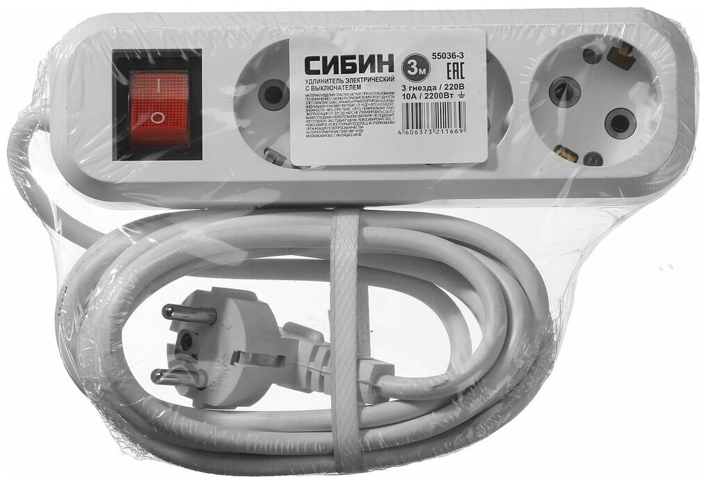 Бытовой удлинитель СИБИН ПВС 3х0.75 3гн. 3м выключатель 2200Вт, У-30В (55036-3) информация: