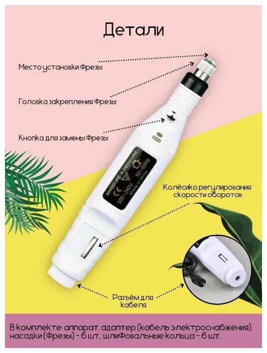 Аппарат-ручка для маникюра и педикюра, фрезер для маникюра, 6 насадок, Розовая
