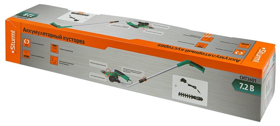 CHT3601 Аккумуляторный кусторез Sturm!, 7,2 В, 1,5 Ач, рез 120 мм, рукоятка-удлинитель, колеса Sturm!