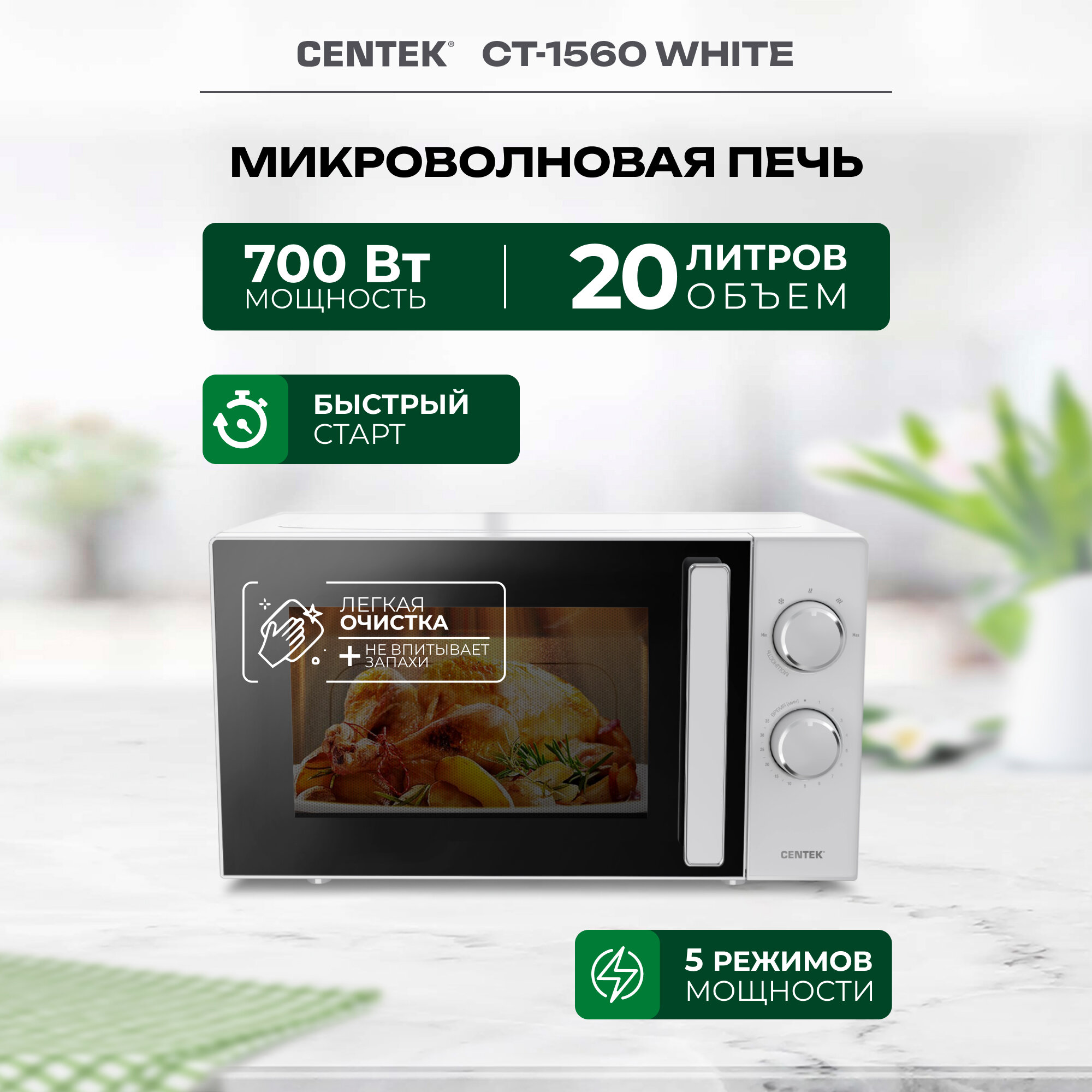 Микроволновая печь CENTEK CT-1560 Белый 700W, 20л, 5 режимов, таймер, подсветка, открыван дверцы ручкой