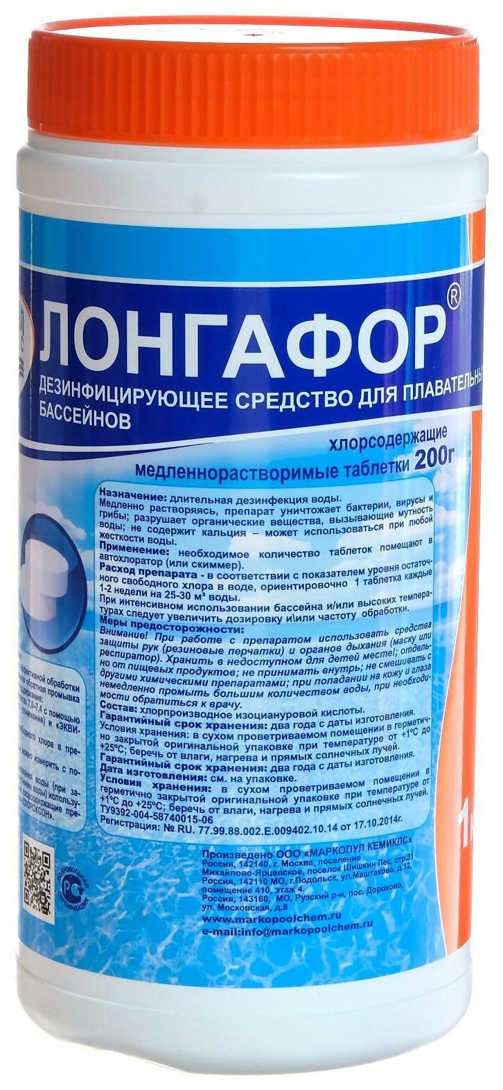 Маркопул Кемиклс Дезинфицирующее средство "Лонгафор", таблетки 200 г, для воды в бассейне, 1 кг