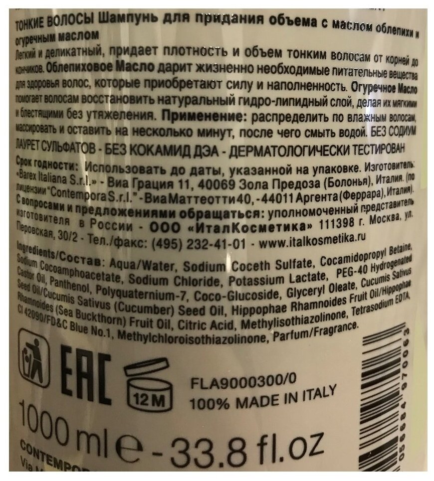 10 цен на Barex Contempora Шампунь для придания объема с маслом Облепихи и Огуречным маслом 1000 мл