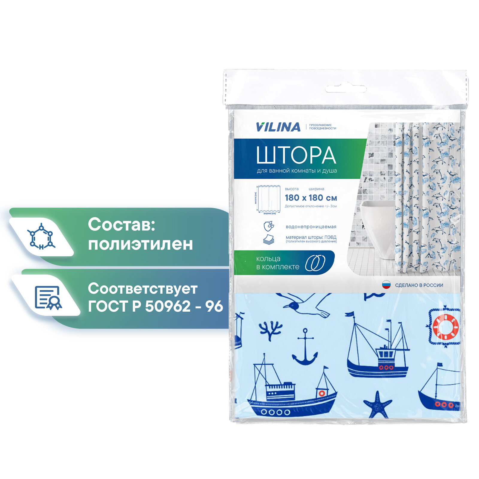 Штора для ванной комнаты VILINA водонепроницаемая с рисунком занавес с кольцами 180х180 см Гавань голубая информация: