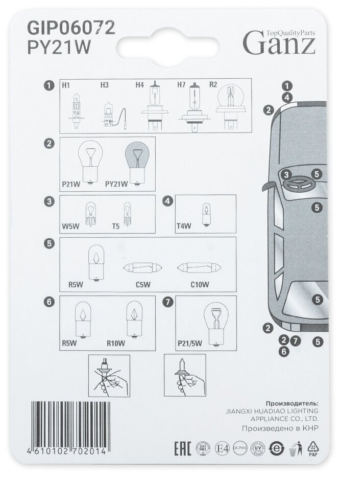 10 цен на GANZ GIP06072 Лампа 12V PY21W 21W BAU15s GANZ 2 шт. блистер GIP06072