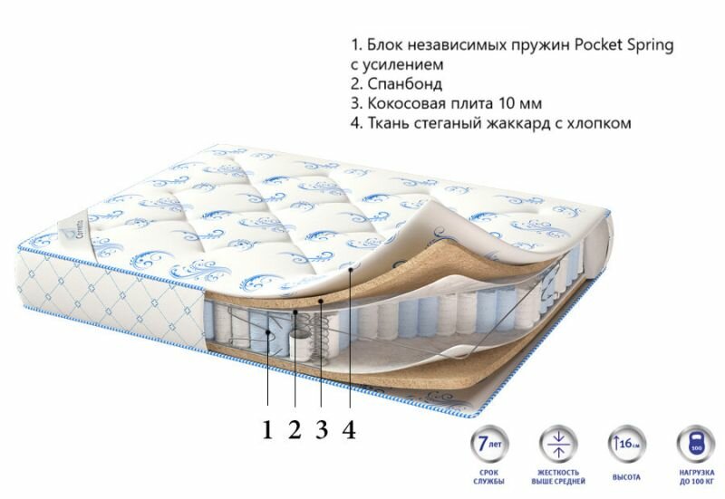 Фабрика Сна Матрас EDMOND, независимые пружины, кокос, средняя жесткость, анатомический, 90х200 см