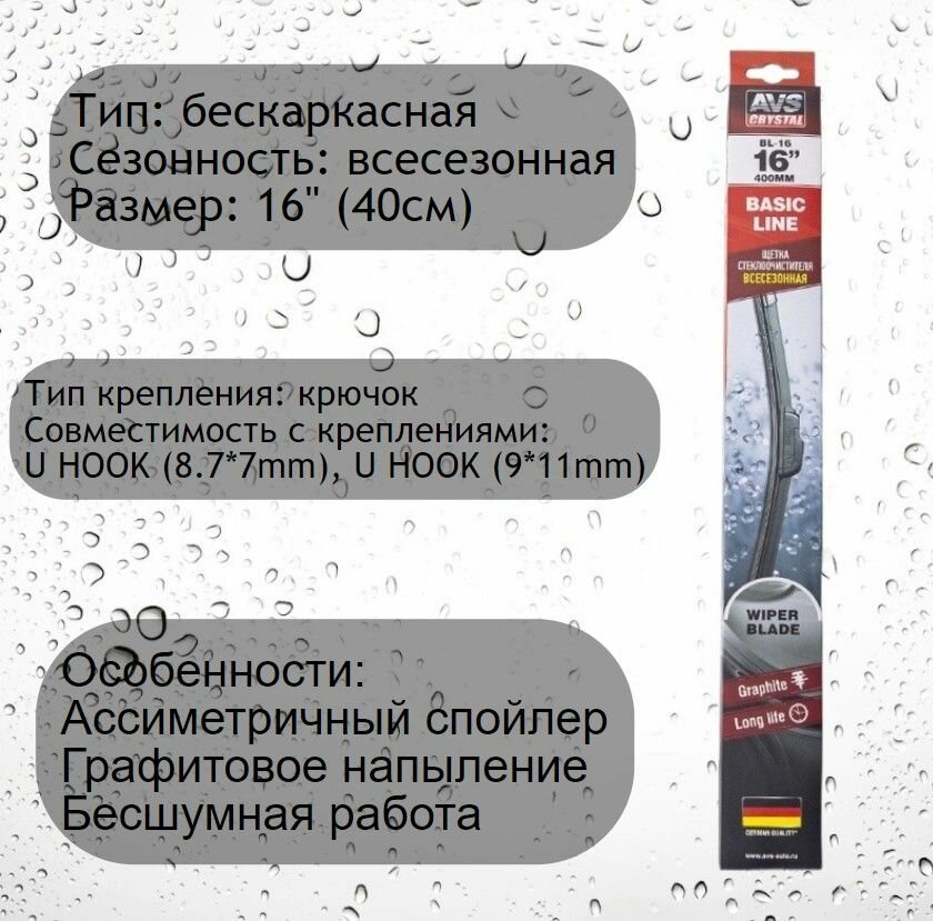 Щетки стеклоочистителя AVS б/к 40см "16" (1шт.) универсальные BL-16 информация: