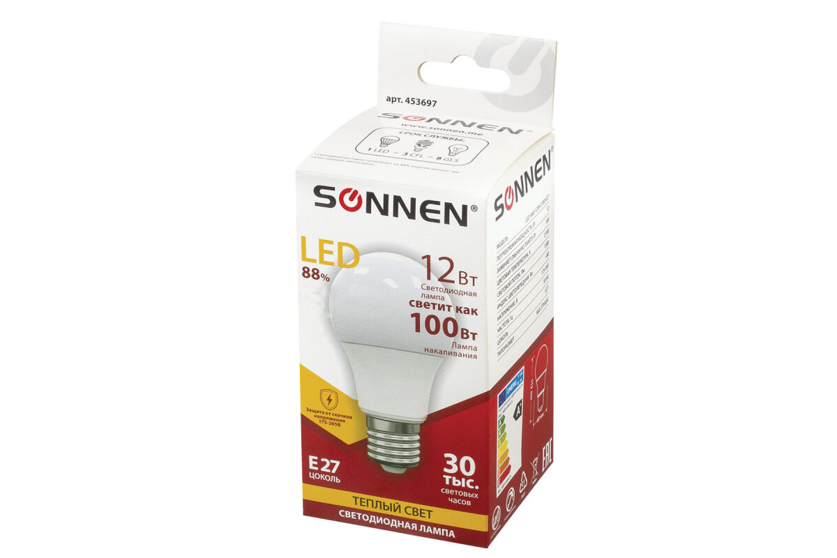 Лампа светодиодная SONNEN, 12 (100) Вт, цоколь Е27, груша, теплый белый свет, 30000 ч, LED A60-12W-2700-E27, 453697 - 10 шт. информация: