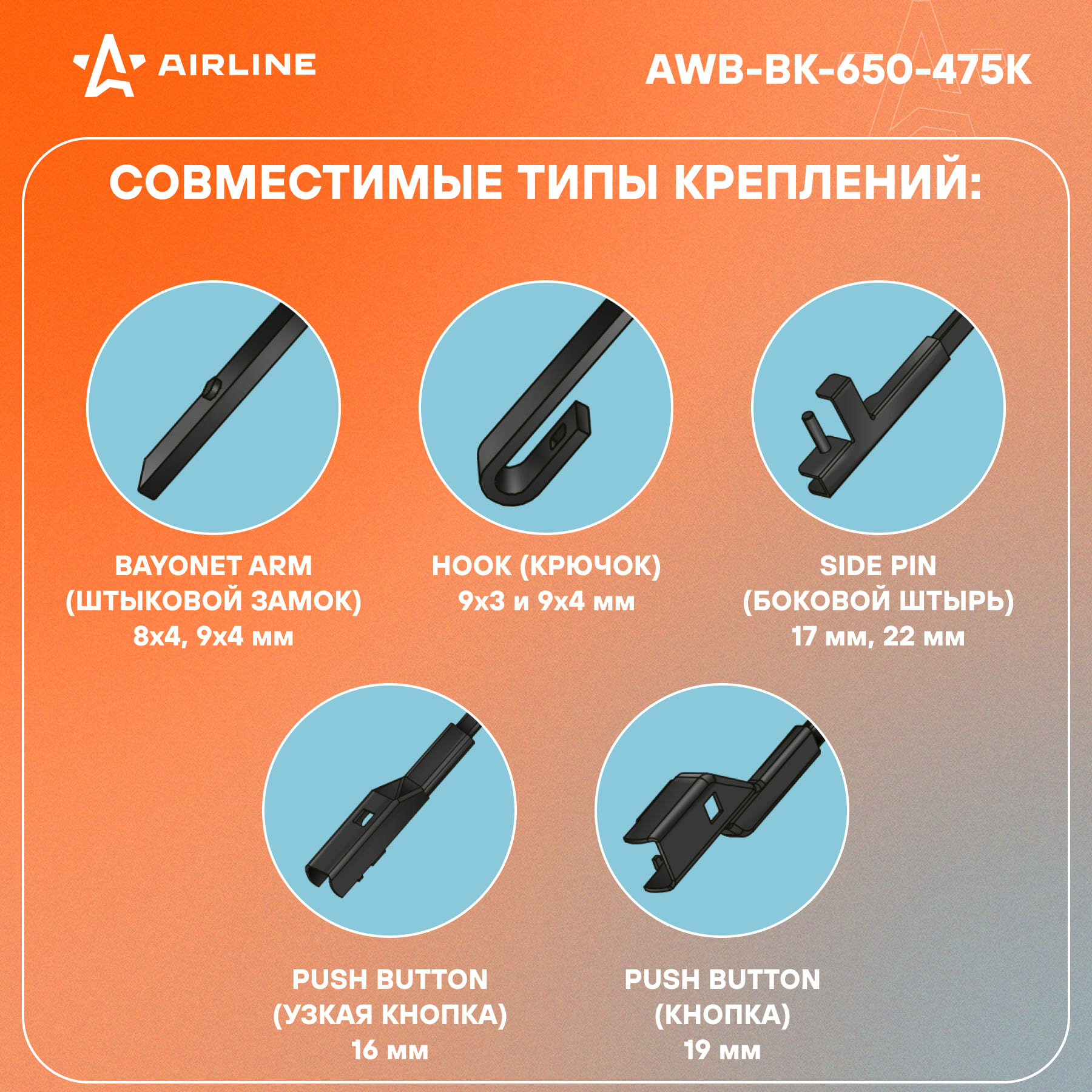 Щетки стеклоочистителя 650/475мм (26"/19") бескаркасные,C-Max 07/10,Mondeo 07/13,Velar 13-,Passat 14-,A3 13-,BMW 5 17-,BMW 7 08/15,15-, 2 шт. 5 типов адптр AWB-BK-650-475K AIRLINE